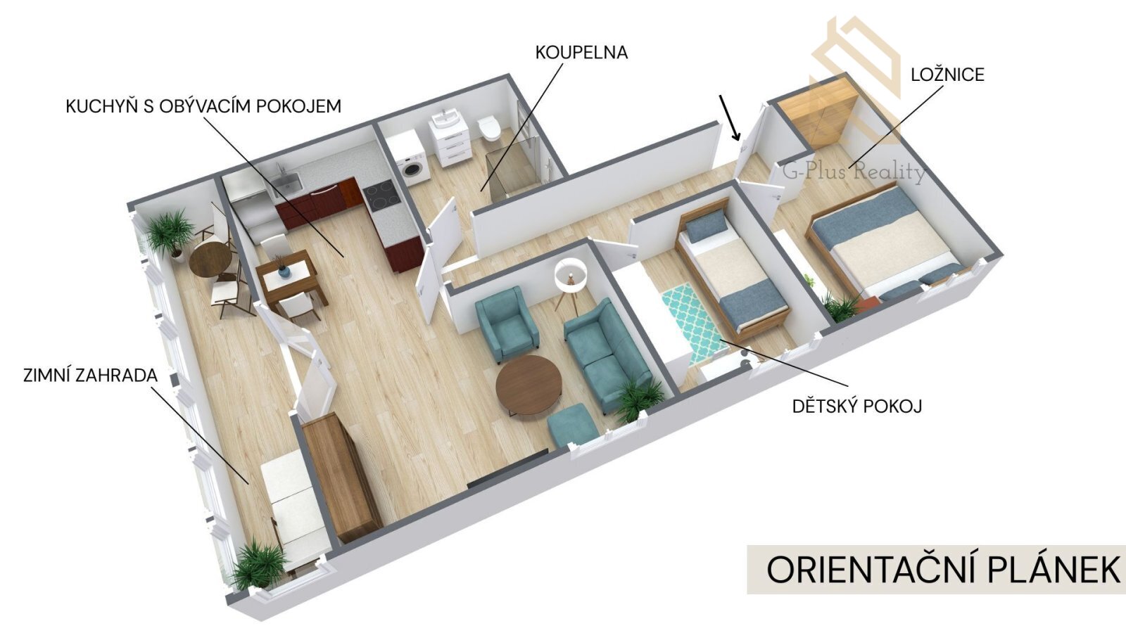 Když vejdete do bytu, prostor působí velmi vzdušně a příjemně. Byt má dvě ložnice a prostorný obývací pokoj s kuchyňským koutem se vstupem do zimní zahrady. Je to ideální místo pro ranní kávu, odpočinek nebo třeba domácí zeleň.Koupelna se sprchovým koutem a WC je vkusně zrekonstruovaná.