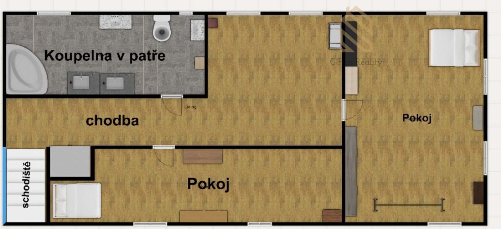 Do patra vede nově vybudované dřevěné schodiště, které působí velmi esteticky a zároveň prakticky. V horním podlaží se nachází další pokoje a druhá koupelna, což umožňuje komfortní dvougenerační bydlení nebo oddělený prostor pro hosty. Velkou výhodou je také podkroví, které je možné vybudovat po celé ploše domu a získat tak další plnohodnotný obytný prostor. Část domu je podsklepená, což poskytuje dostatek úložného místa.