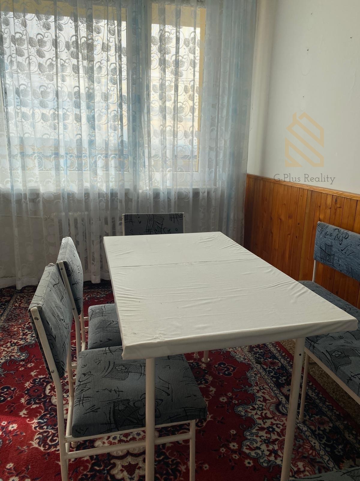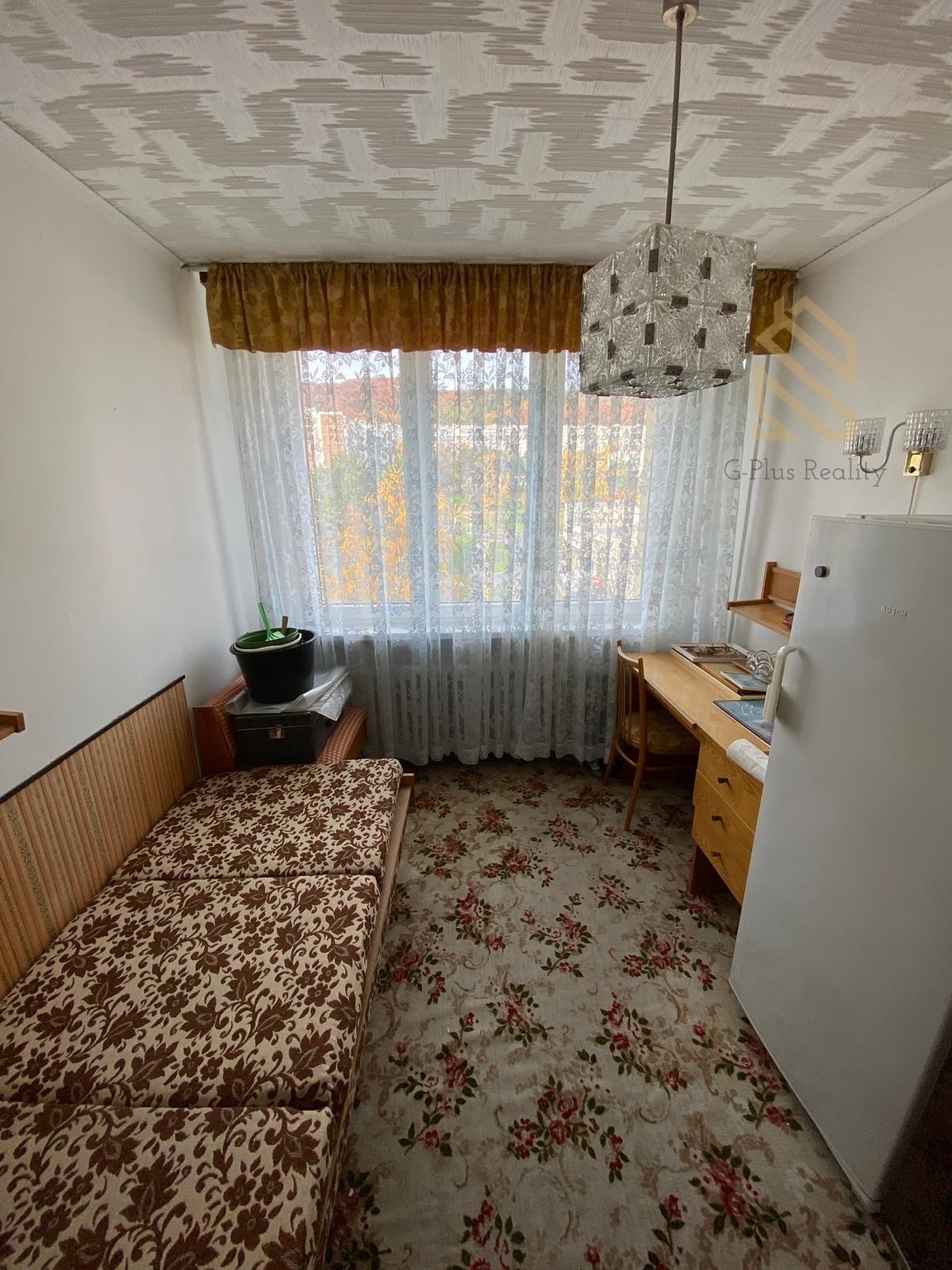 Byt je plně vybaven – k dispozici je postel, skříň, jídelní stůl se židlemi, lednice a další základní vybavení.