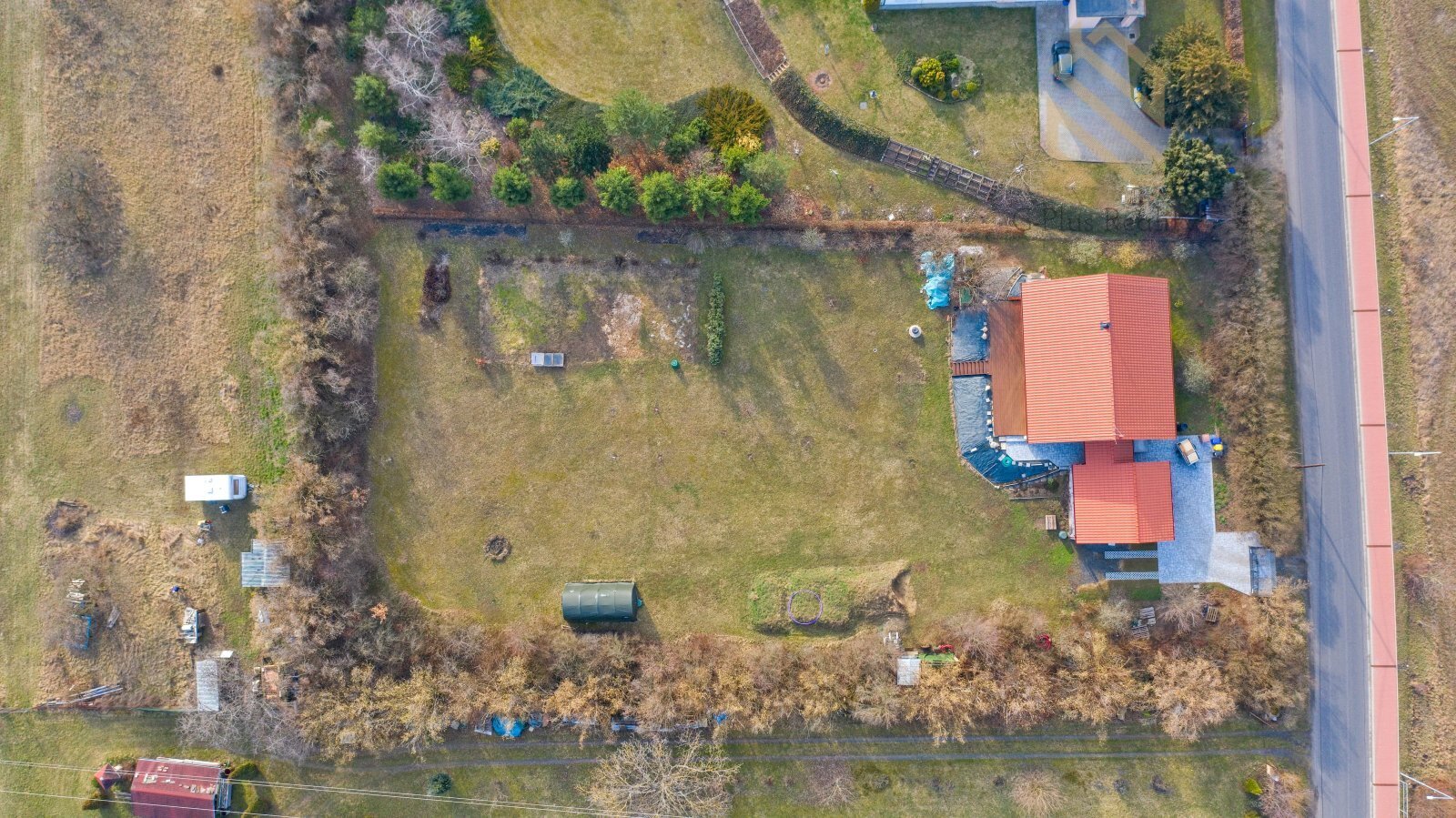 Nemovitost se nachází na mimořádně prostorném pozemku o výměře 3 522 m², který poskytuje široké možnosti využití. Pozemek je osázen ovocnými i okrasnými stromy a keři a nabízí prostor pro pěstování vlastní zeleniny, aktivní i pasivní odpočinek, chov zvířat od drobného hospodářství až po koně, případně možnost drobného podnikání. Díky vzrostlému smíšenému porostu po obvodu pozemku je zajištěna vysoká míra soukromí.